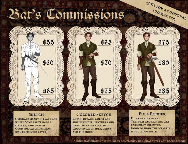 If multiple Commission are ordered, I work on them in a row one item at a time with different deadlines. Faster work costs extra and depends on the queue and amount of work.○ Requested art is an art made for free on request of Users in social media. This type of art doesnt have deadline, I have a right to not create art with requested character at all.○ Because of several factors i cant control, i cant do refunds and i finish my work to the point it was paid for.