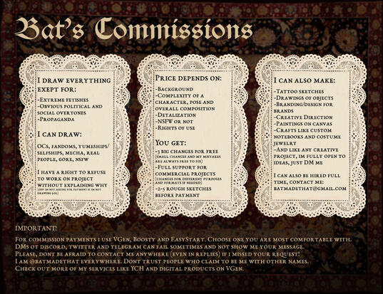 ○ I reserve the right to refuse a request at my own discretion.○ Payment comes fully after discussing idea and creating fast rough sketches that look like stickmen. They needed to catch the idea and mood and to understand if we can work together. It was also made to prevent AI scam schemes.○ First consultation is free and contains creating fast rough sketches, answering and asking questions and discuss ideas and prices. Feel free to consulate before actual work.○ Only first 3 changes are free (i. e., correcting details). Other are coming for additional payment. Changes are free if there was my mistake in design and/or I forgot to add something Commissioner (you) and I discussed.○ One Commission (e.g., picture, craft item, sticker set, etc.) will be done in one month after the date of payment.